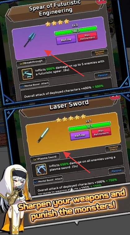 3、收集裝備,消耗材料“Refine“Retinement,提升武器等級、詞條效果,搭配角色,優(yōu)化輸出。