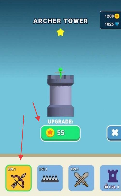3、消耗金幣、鉆石,在“ARCHERTOWER”界面,升級防御塔,解鎖新塔種,提升射程、傷害,增強(qiáng)防御能力。