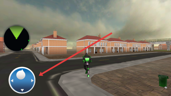 2、在城市場景,通過左下角虛擬搖桿,控制機器人移動,探索游戲中的街道、建筑,觸發(fā)任務(wù)。