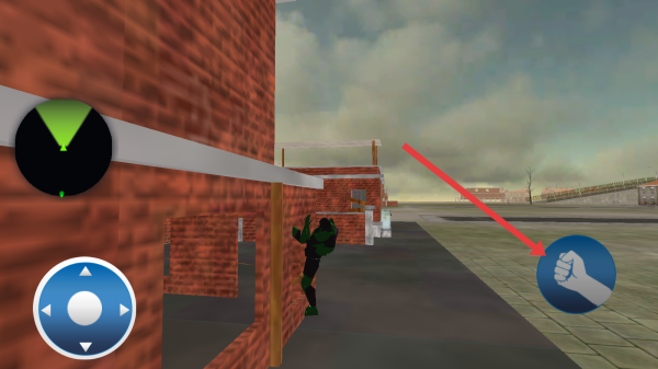 3、遇到可互動目標(biāo)(如建筑內(nèi)區(qū)域),點擊右側(cè)拳頭圖標(biāo),釋放攻擊/交互技能,推進(jìn)游戲流程。