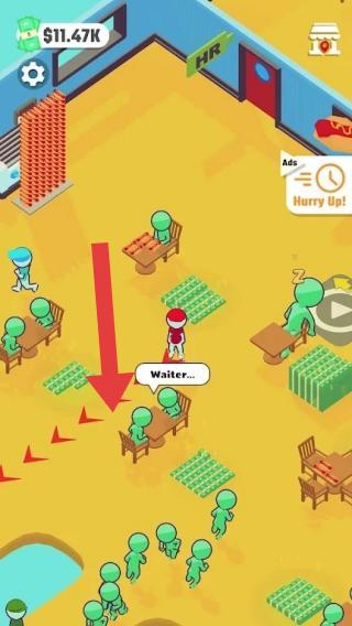 3、呈現(xiàn)披薩店經(jīng)營場景,有資金顯示($11.47K)、角色(顧客、服務(wù)員等),還有“Waiter...”(服務(wù)員相關(guān)需求),屬于店鋪運(yùn)營、顧客服務(wù)的環(huán)節(jié)。