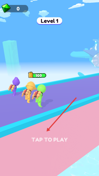 1、“Level1”界面點【TAP TO PLAY】,選綠色角色,跟隊友沿賽道跑,避障礙搶道具。