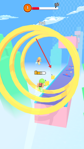 2、過黃色圓環(huán)時,借其加速,收集途中黃色方塊(如“50”),提升道具使用次數(shù)。