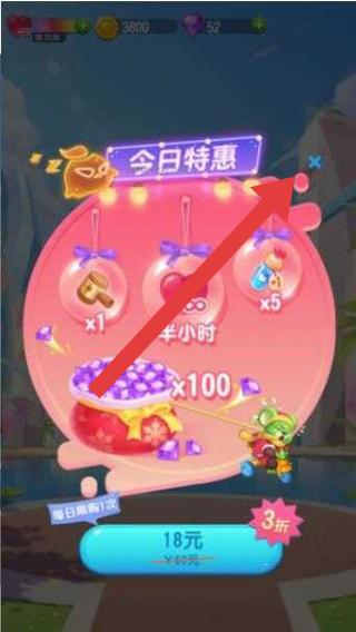 3、若彈出“今日特惠”廣告,點(diǎn)擊箭頭處關(guān)閉按鈕,或按需選擇特惠禮包,獲取道具,助力后續(xù)關(guān)卡。