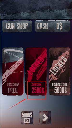 2、進(jìn)入武器商店界面,用積攢的5000金幣購買被紅框選中的霰彈槍,這把價(jià)值2500金幣的武器能有效提升生存能力。