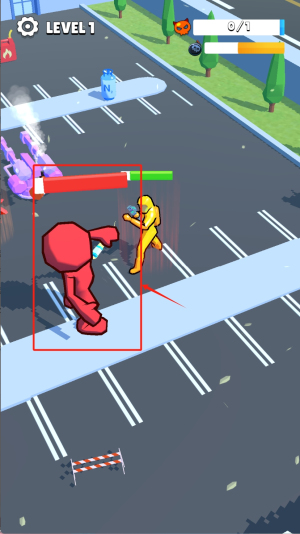 2、進(jìn)入戰(zhàn)斗場(chǎng)景后,控制紅色角色對(duì)抗黃色敵人,通過(guò)走位躲避對(duì)方拳擊,利用生命條下方的能量槽發(fā)動(dòng)特殊技能反擊。
