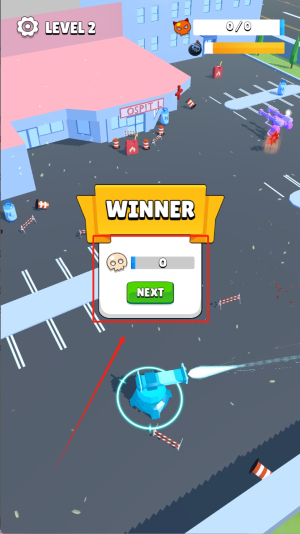 3、第二關(guān)卡駕駛藍(lán)色飛行器,使用水流攻擊消滅敵對(duì)目標(biāo),擊敗所有敵人后點(diǎn)擊"NEXT"按鈕,進(jìn)入結(jié)算界面領(lǐng)取通關(guān)獎(jiǎng)勵(lì)。