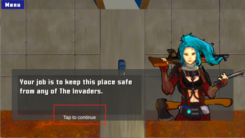1、游戲開始時點擊"Tap to continue"進(jìn)入主界面,閱讀藍(lán)發(fā)角色旁的任務(wù)提示"守護(hù)地點免受入侵者侵?jǐn)_",了解基礎(chǔ)游戲目標(biāo)。