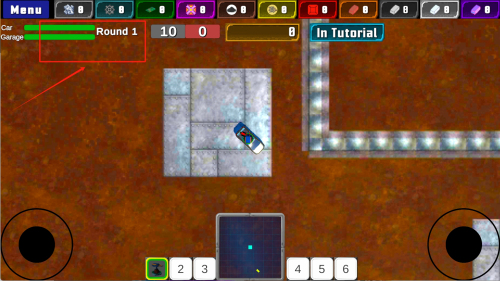 3、在第三張圖的方格場地中,使用底部數(shù)字鍵1-6選擇武器或道具,通過左右圓形操控區(qū)駕駛車輛沿亮線區(qū)域移動,完成首輪教程任務(wù)。