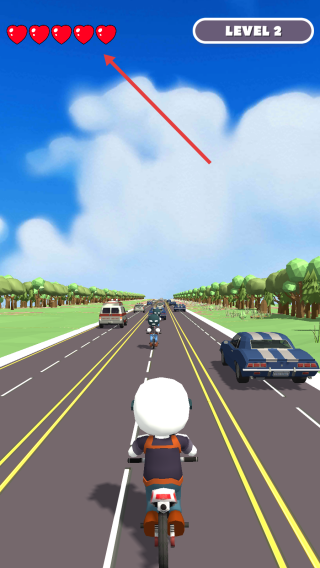 2、LEVEL 2階段,控摩托避車,保上方愛心(血量 ),別碰撞。