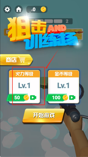 1、在主界面點(diǎn)擊"開(kāi)始游戲"按鈕進(jìn)入訓(xùn)練場(chǎng),注意上方火力等級(jí)和金幣等級(jí)提示,積累50金幣可優(yōu)先升級(jí)武器威力。