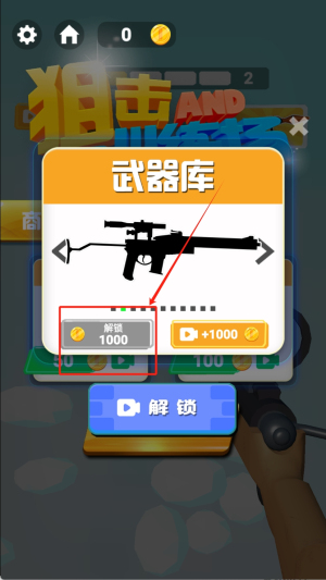 2、進(jìn)入武器庫(kù)界面選擇心儀狙擊槍?zhuān)c(diǎn)擊"解鎖"按鈕消耗1000金幣購(gòu)買(mǎi)裝備,金幣不足時(shí)可點(diǎn)擊"+1000"快速充值。