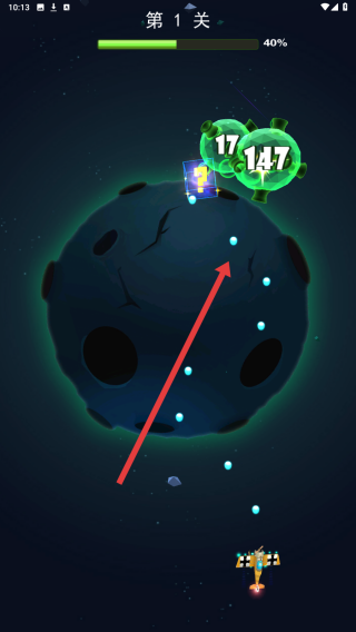 2、戰(zhàn)斗中,操控飛機(jī),按箭頭指引,射擊星球上的綠色怪物(如17、147數(shù)值標(biāo)識(shí)),躲避障礙,推進(jìn)進(jìn)度。