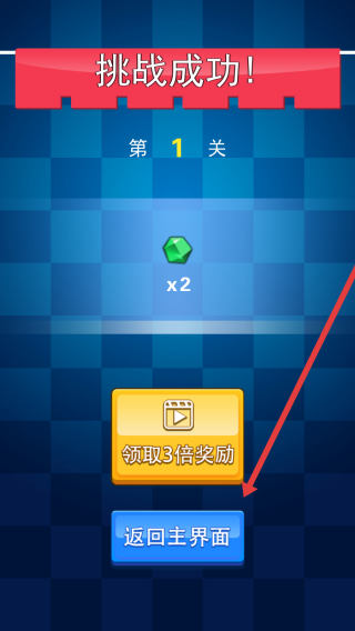 3、挑戰(zhàn)成功后,可以通過(guò)看廣告領(lǐng)3倍獎(jiǎng)勵(lì)(2個(gè)綠寶石),或直接點(diǎn)【返回主界面】,準(zhǔn)備下一關(guān)。