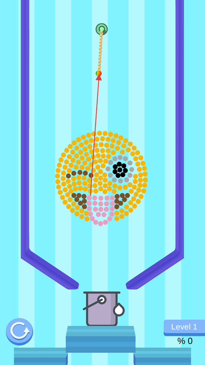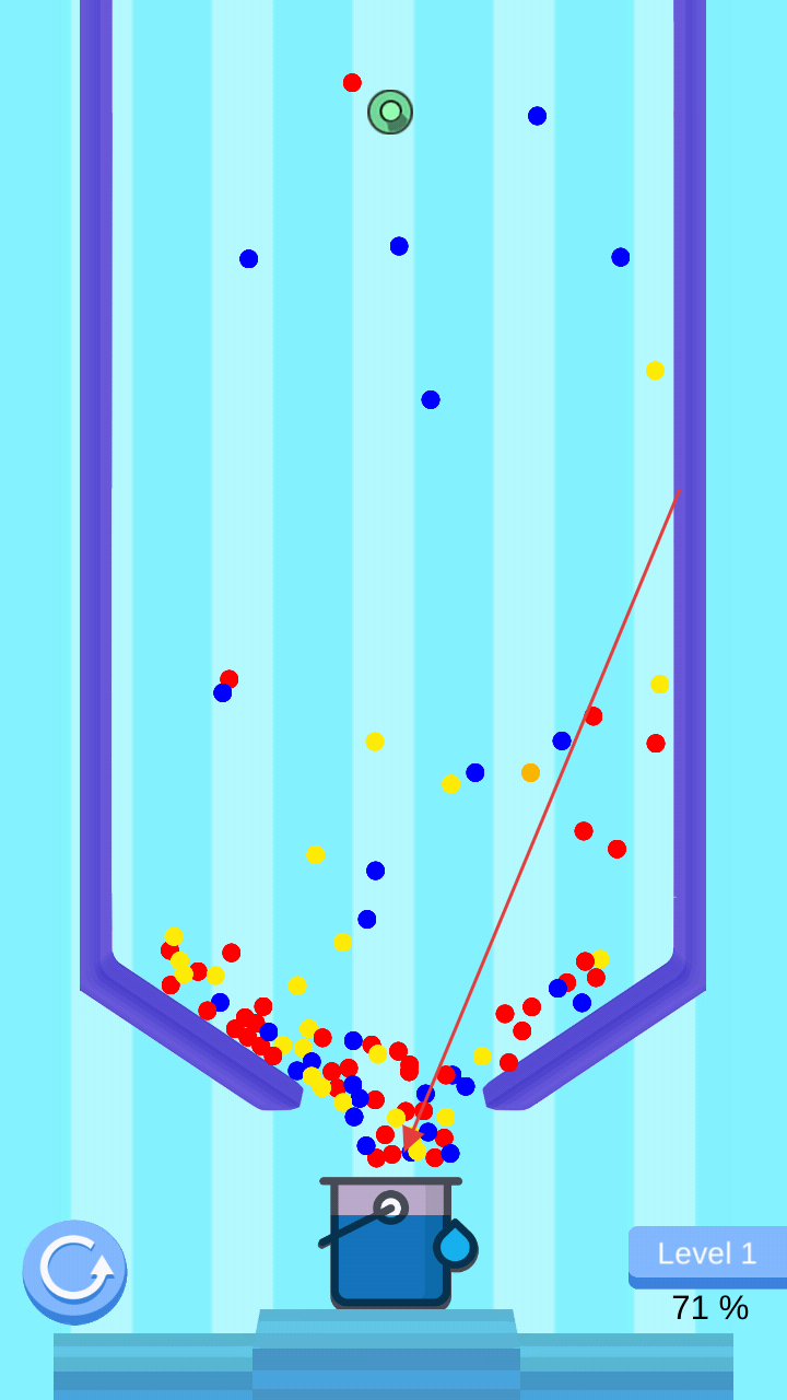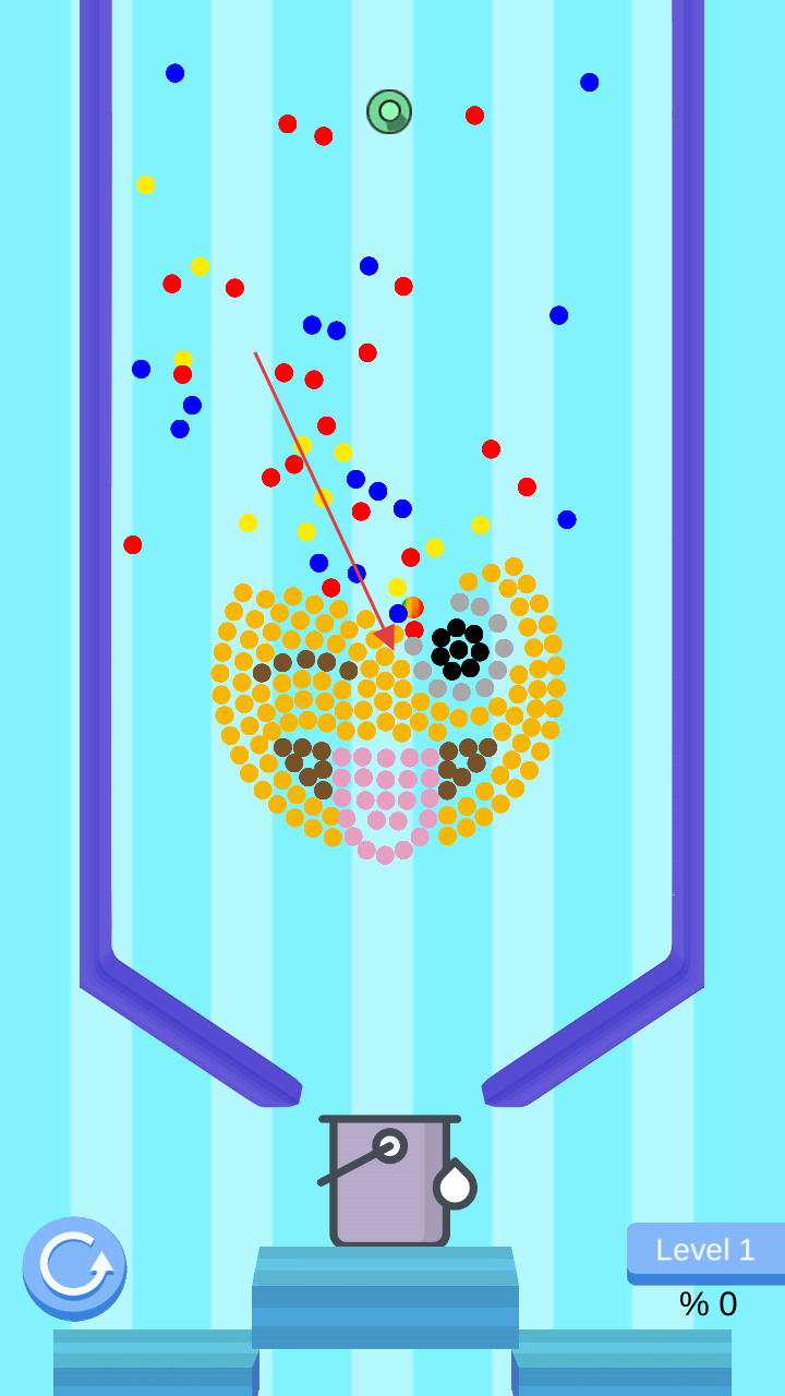 2、點(diǎn)擊屏幕釋放頂部小球,讓其墜落并碰撞、消除同色小球,填充下方容器。