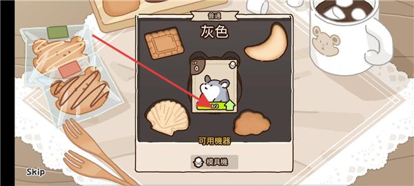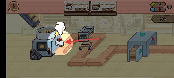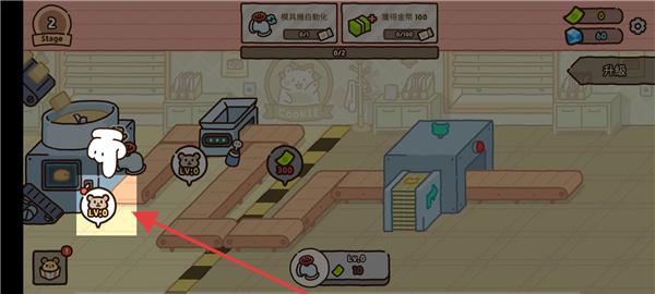 1、第1階段(Stage1)烘焙車間,白色貓咪操作機器,有“自動包裝曲奇餅”等制作流程,可升級(升級按鈕)。