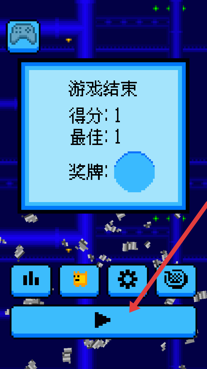 2、游戲結(jié)束后,界面顯示得分與最佳記錄,點(diǎn)擊底部藍(lán)色【播放按鈕】,可重新開(kāi)始挑戰(zhàn),沖擊更高成績(jī)。