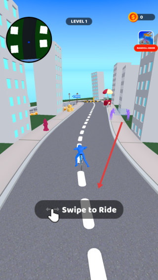 1、LEVEL1開局,按【Swipe to Ride】滑動,啟動藍色小人騎車。