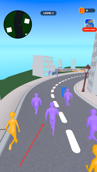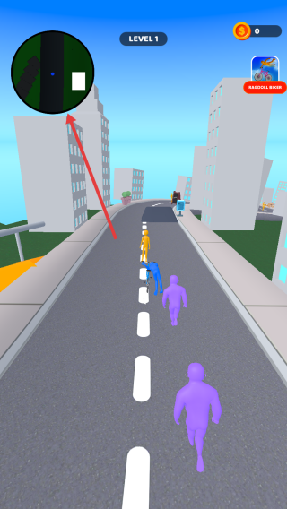 2、看左上角小地圖,沿路線超黃色、紫色行人,別碰撞。