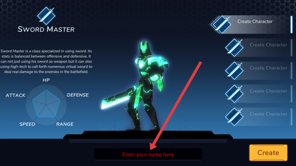 1、在角色創(chuàng)建頁,輸入名稱(“Enter-your-name-here”框),選“Sword-Master”職業(yè),點(diǎn)【Create】,生成角色。