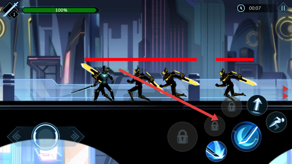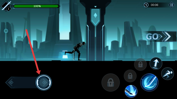 2、進(jìn)入游戲,操控角色(黑色剪影),用左側(cè)搖桿移動(dòng),右側(cè)技能鍵(如藍(lán)色劍技)攻擊,按箭頭指引,在未來都市場景戰(zhàn)斗,推進(jìn)關(guān)卡。