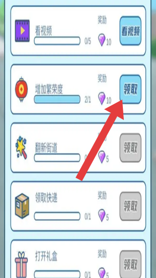3、包含“看視頻”“增加繁榮度”“翻新街道”等任務(wù)及獎(jiǎng)勵(lì)(鉆石),“增加繁榮度”任務(wù)已滿(mǎn)足條件可“領(lǐng)取”獎(jiǎng)勵(lì),屬于日常任務(wù)、獎(jiǎng)勵(lì)獲取的功能模塊。