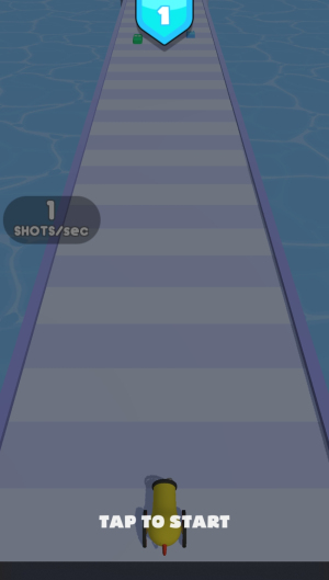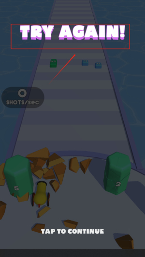 2、當(dāng)游戲失敗時界面會顯示"TRY AGAIN!"提示,查看當(dāng)前射擊頻率為5發(fā)/秒,點擊"TAP TO CONTINUE"重新開始挑戰(zhàn)。