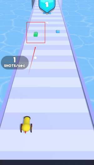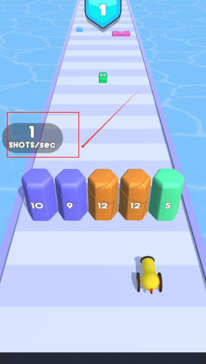3、在水上賽道場景中,觀察前方標(biāo)有數(shù)字的彩色方塊障礙物,根據(jù)左下角顯示的1發(fā)/秒射擊頻率,合理規(guī)劃射擊順序清除障礙。