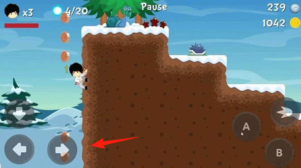 1、操控黑發(fā)角色(紅箭頭),在雪地場景,用方向鍵(左右),攀爬土坡,躲避蝸牛刺猬,收集金幣(4/20→更多)。