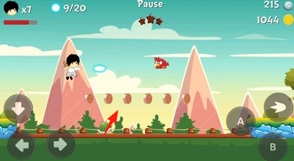 2、進(jìn)入山地關(guān)卡(紅箭頭),點擊跳躍(A鍵),穿過火圈,躲避飛鳥,收集道具(9/20進(jìn)度),推進(jìn)地圖。