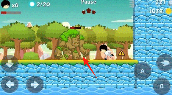 3、遇到樹精BOSS(紅箭頭),控制角色,靈活移動(方向鍵+跳躍),躲避攻擊,找時機(jī)反擊,擊敗BOSS,通關(guān)森林。