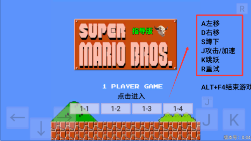 1、玩家通過(guò)A/D鍵控制左右移動(dòng),S鍵下蹲,J鍵進(jìn)行攻擊或加速,K鍵跳躍,R鍵重試,ALT+F4可退出游戲。