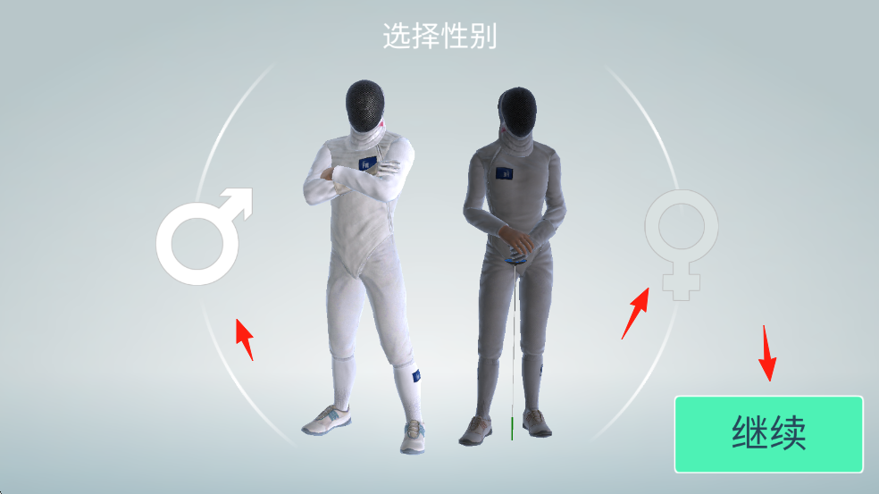 1、進(jìn)入游戲先【選擇性別】,點(diǎn)擊對應(yīng)性別標(biāo)識后,再點(diǎn)【繼續(xù)】按鈕進(jìn)入下一環(huán)節(jié)。