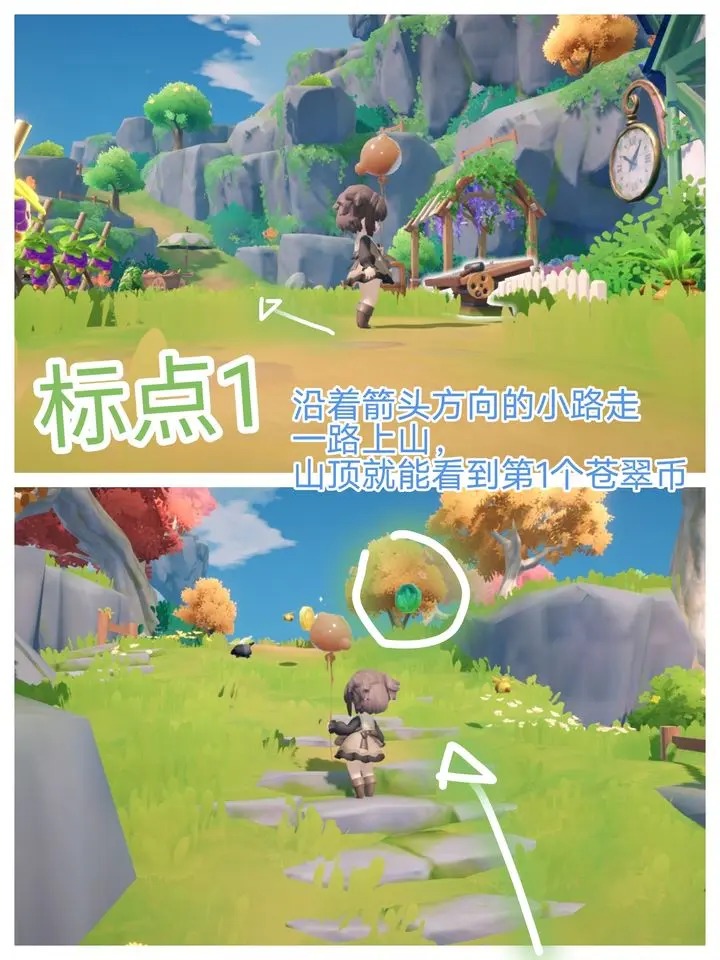 1、沿著箭頭方向的小路走一路上山,山頂就能看到第1個蒼翠幣。