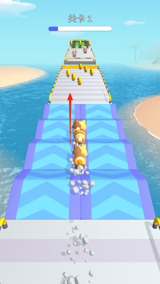 2、遇到障礙(紅箭頭),左右滑動,躲避石頭,撞擊金幣,疊加貓咪數(shù)量(雙貓→更多),提升得分。