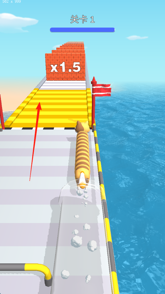 3、沖刺階段(紅箭頭),沖向倍數(shù)墻(x1.5),用疊加貓咪,撞擊突破,沖過終點旗,完成關卡,解鎖新地圖。