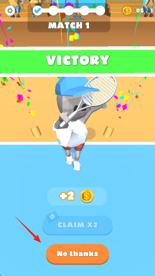 3、勝利結(jié)算獲勝顯示“VICTORY”,獲金幣(+2),可選擇“CLAIMX2(雙倍領(lǐng)?。被颉癗othanks(跳過)”,進(jìn)入下一回合。