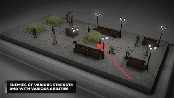 2、戶外廣場場景,有不同強度、能力的敵人,體現(xiàn)戰(zhàn)斗對抗元素,可進行戰(zhàn)術布局。