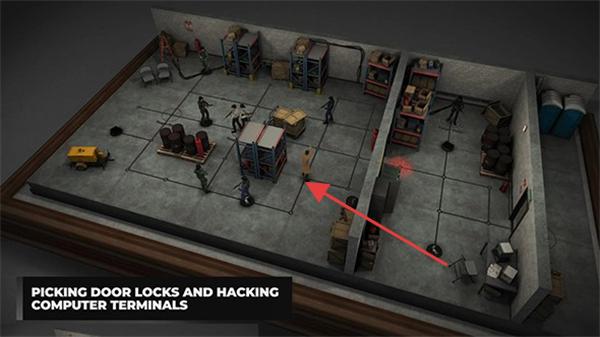 3、倉庫場景,涉及“PICKING DOOR LOCKS AND HACKING COMPUTER TERMINALS”(撬門鎖、黑入電腦終端)玩法,展現(xiàn)潛入、解謎等策略操作。