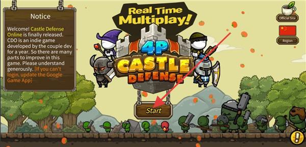 1、游戲啟動界面,顯示“4P CASTLE DEFENSE”,支持實時多人玩法,點擊“Start”開始游戲,有官方博客、語言(Chinese)等入口。