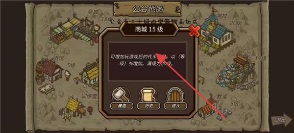 3、公會地圖界面,展示“商城15級”信息,可增加玩家戰(zhàn)后代幣獲?。ㄐ迯图壴黾?,滿級20%),有“建造”“歷史”“進入”操作。