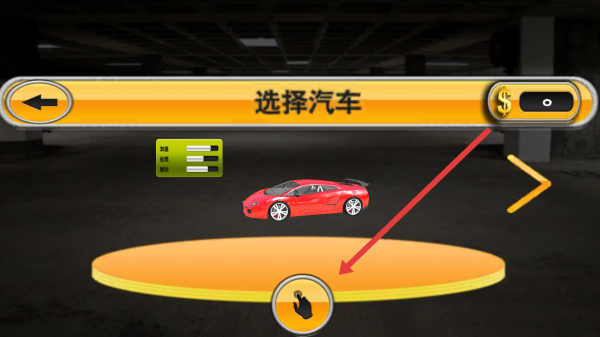 2、在“選擇汽車”頁,點擊紅色跑車下方按鈕,確認(rèn)車輛,進(jìn)入關(guān)卡選擇,準(zhǔn)備挑戰(zhàn)特技賽道。