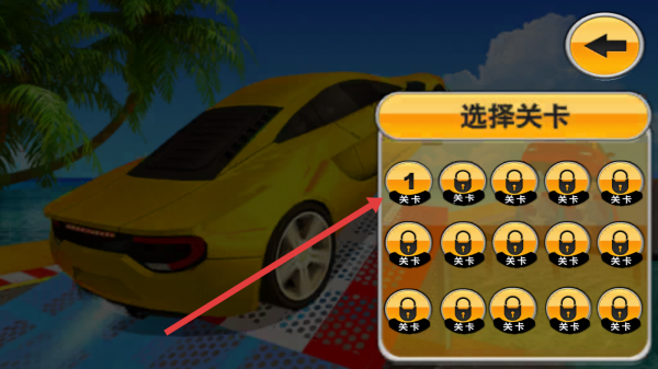3、進(jìn)入“選擇關(guān)卡”界面,點擊【關(guān)卡1】,開始首關(guān),駕駛黃色賽車,完成水上特技任務(wù)。