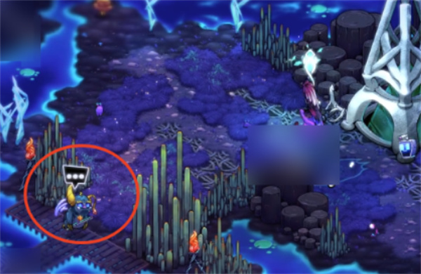 環(huán)境特征:傳送點位于一座木質(zhì)瞭望塔旁,周圍分布3-4棵紫色熒光樹,前方可見一條東西走向的石磚路,右側(cè)為河流方向,左側(cè)為森林區(qū)域,NPC位于森林邊緣與道路交叉口處。