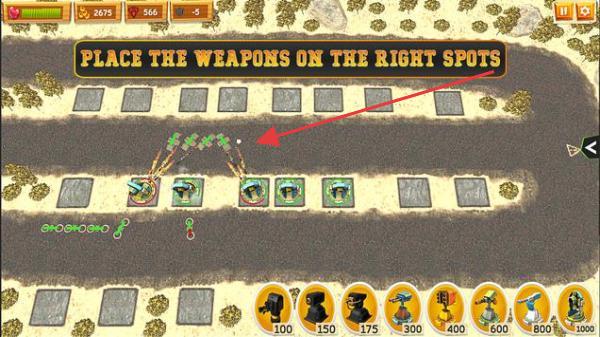 2、遵循【PLACE THE WEAPONS ON THE RIGHT SPOTS】指引,挑選武器放置到道路空位,構(gòu)建交叉火力防線。