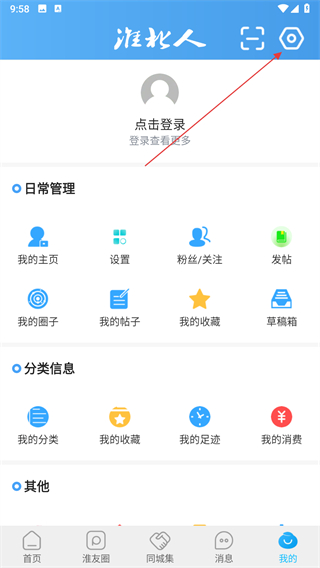 1、打開(kāi)淮北人APP,點(diǎn)進(jìn)入個(gè)人頁(yè)面后點(diǎn)擊設(shè)置圖標(biāo),進(jìn)入設(shè)置。