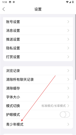 2、在設(shè)置頁(yè)面點(diǎn)擊青少年模式選項(xiàng),即可進(jìn)入青少年模式頁(yè)面。