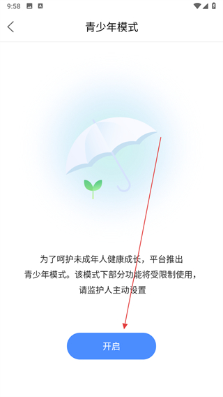 3、在青少年模式頁(yè)面點(diǎn)擊開(kāi)啟按鈕,進(jìn)入設(shè)置獨(dú)立密碼頁(yè)面。