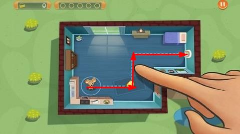 1、進(jìn)入游戲第一關(guān)教學(xué)關(guān)卡,沿著屏幕上手指和路線的軌跡滑動(dòng),讓小老鼠順利吃到奶酪并到達(dá)出口。