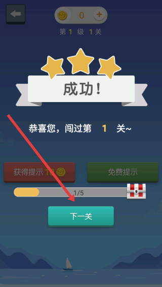3、通關后,點擊【下一關】,繼續(xù)挑戰(zhàn)第2關,積累星星,推進“初見”章節(jié)(0/100→逐步解鎖)。